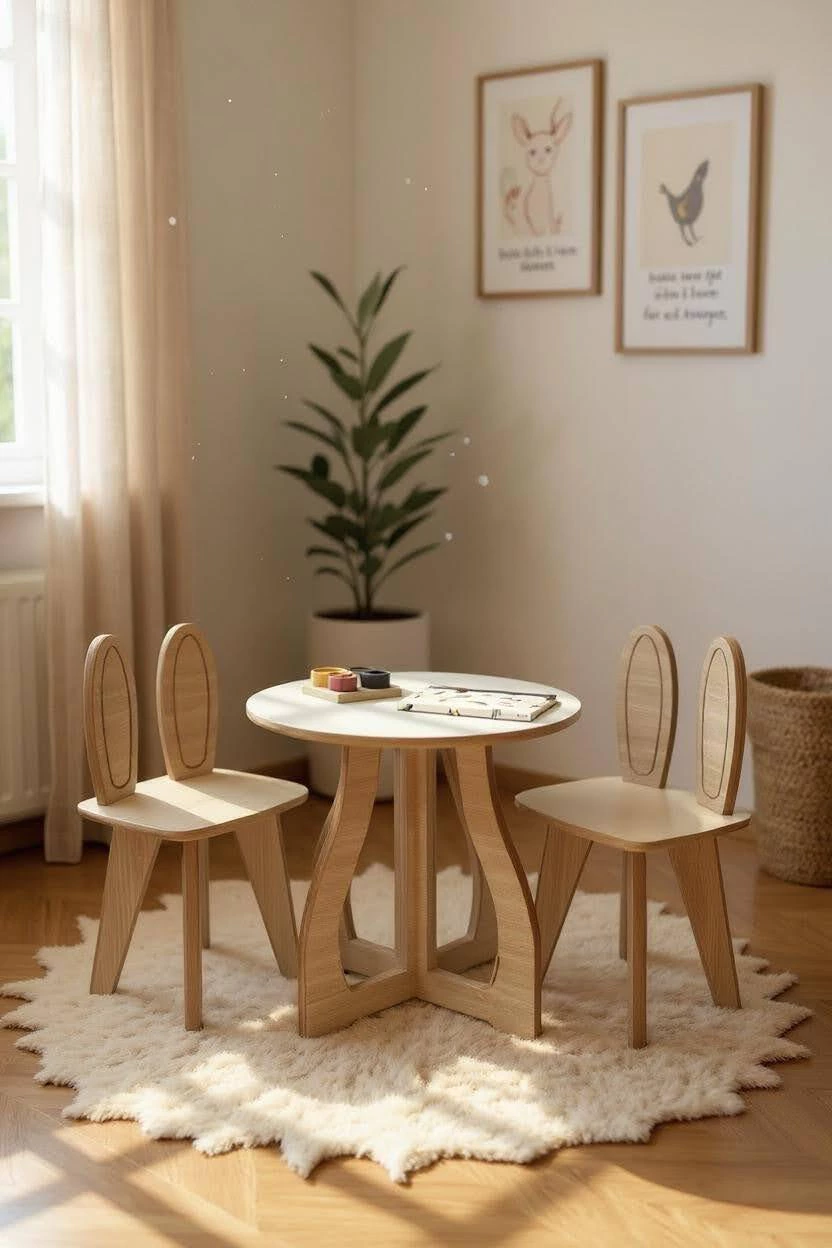 El Combo Flora Kids es ideal para armar un rincón de juego, dibujo y actividades en el dormitorio infantil o playroom. Incluye una mesa infantil redonda y 2 banquitos con orejas a elección, creando un espacio cómodo y pensado para chicos.