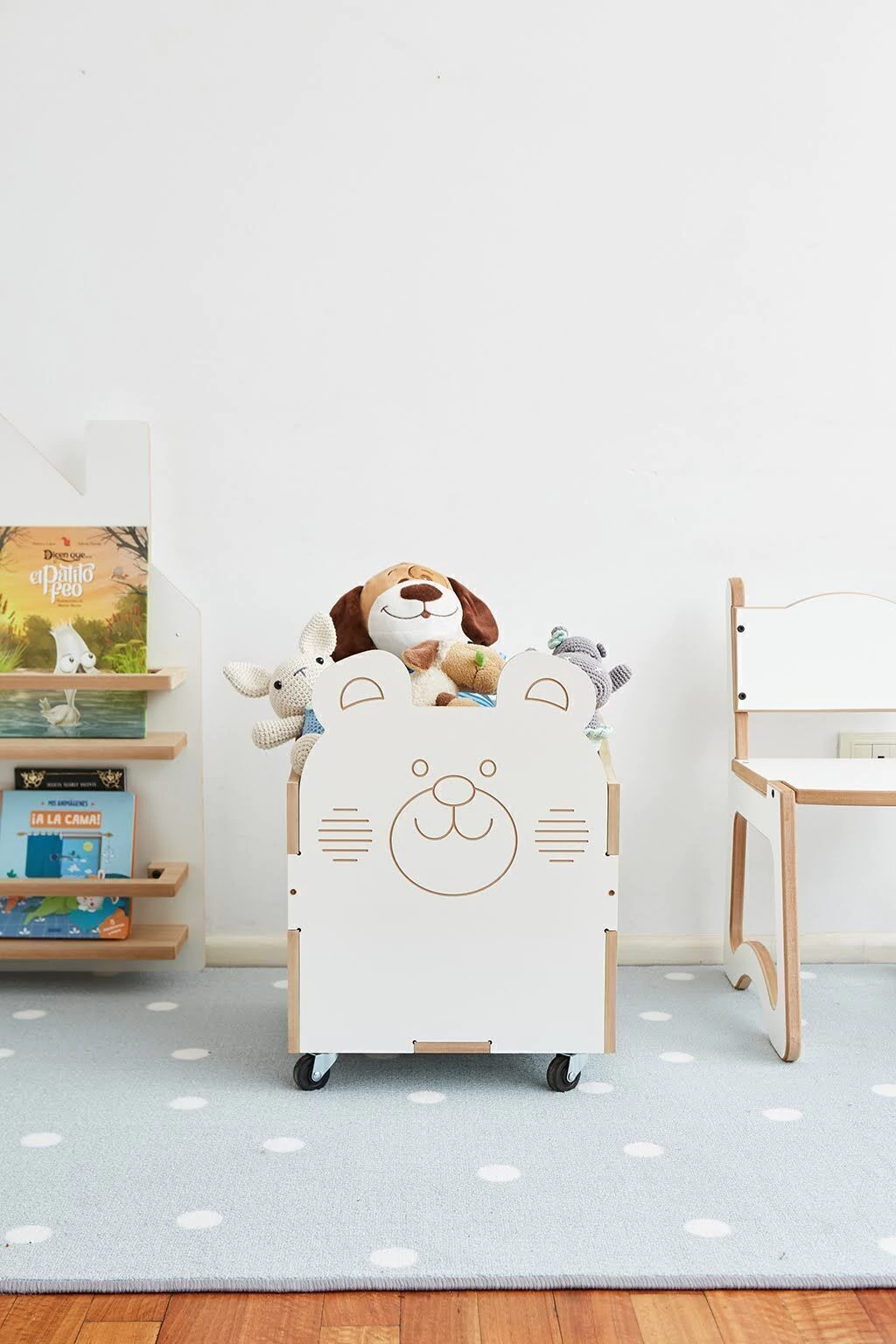 Su formato tipo baúl permite guardar juguetes, peluches, libros y objetos grandes de forma rápida y práctica. Gracias a sus ruedas industriales, los chicos pueden moverlo fácilmente, fomentando la autonomía y el hábito de ordenar después de jugar.