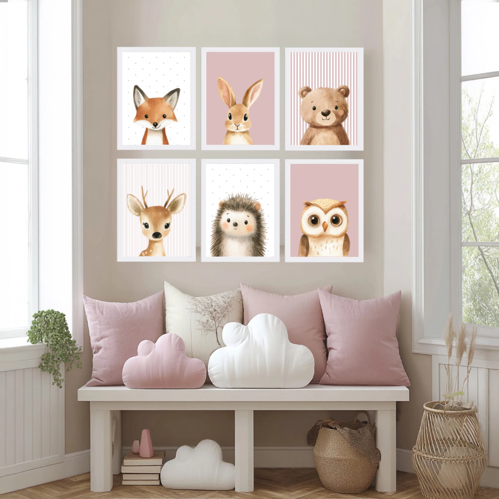 Transformá el dormitorio en un rincón cálido, moderno y lleno de magia con este Set x6 Cuadros Infantiles “Animales del Bosque”. Diseñados en tonos suaves y neutros, combinan perfecto con habitaciones estilo Montessori, nórdico o boho.